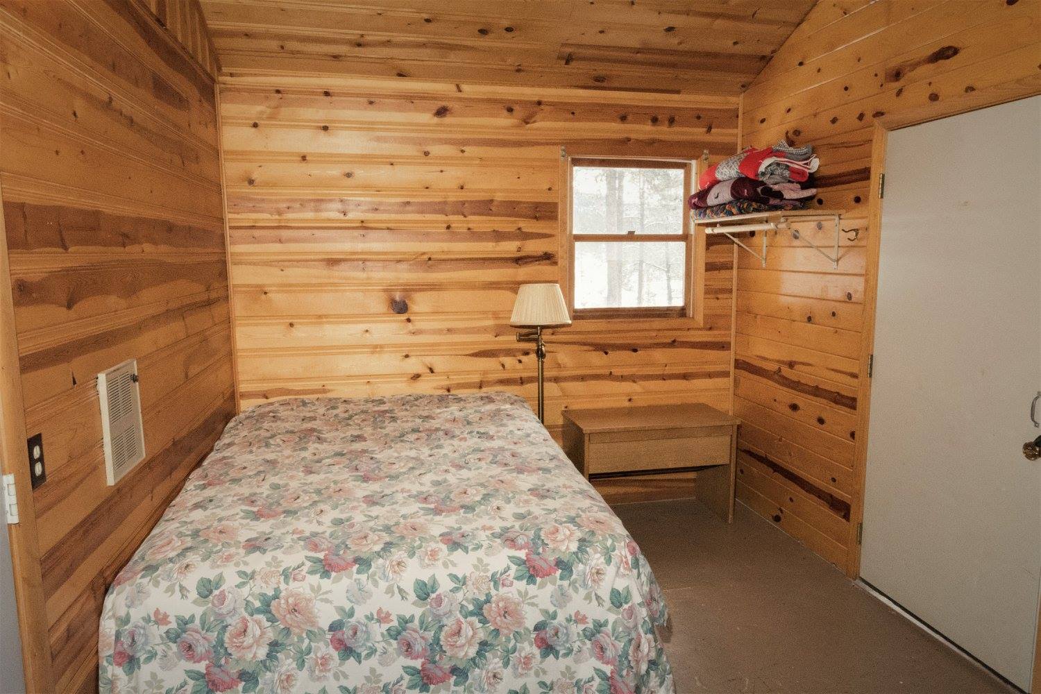 Cabins sleep 8 (1 queen + 3–4 bunk beds), with nearby showers and toilets.